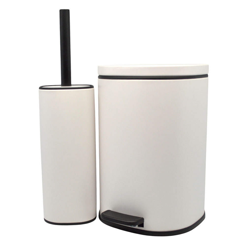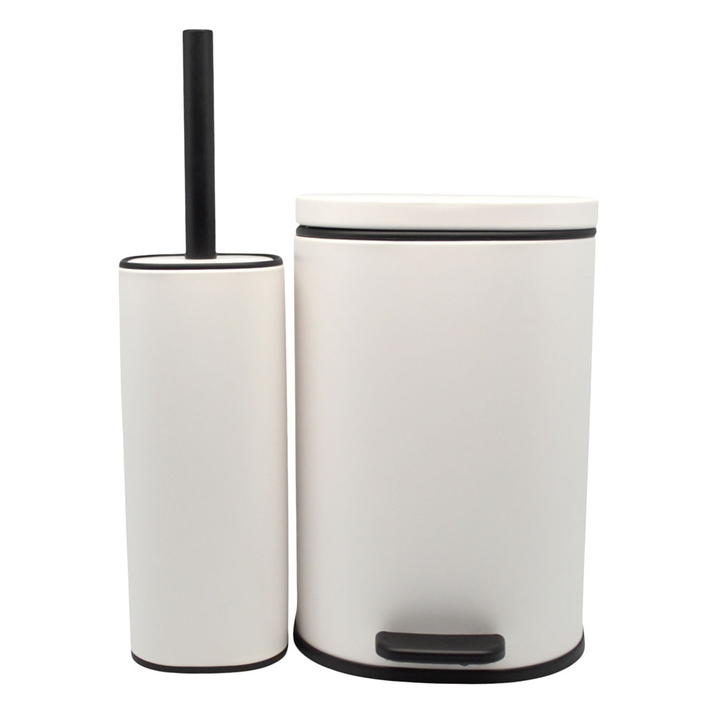 Σετ με κάδο απορριμμάτων και πιγκάλ, από ανοξείδωτο ατσάλι με άσπρο ματ φινίρισμα που δεν αφήνει δαχτυλικά αποτυπώματα. Ο κάδος έχει καπάκι με αυτόματο κλείσιμο κ αφαιρούμενο εσωτερικό κάδο για εύκολο καθάρισμα.Το πιγκάλ διαθέτει μαύρο ανθεκτικό βουρτσάκι