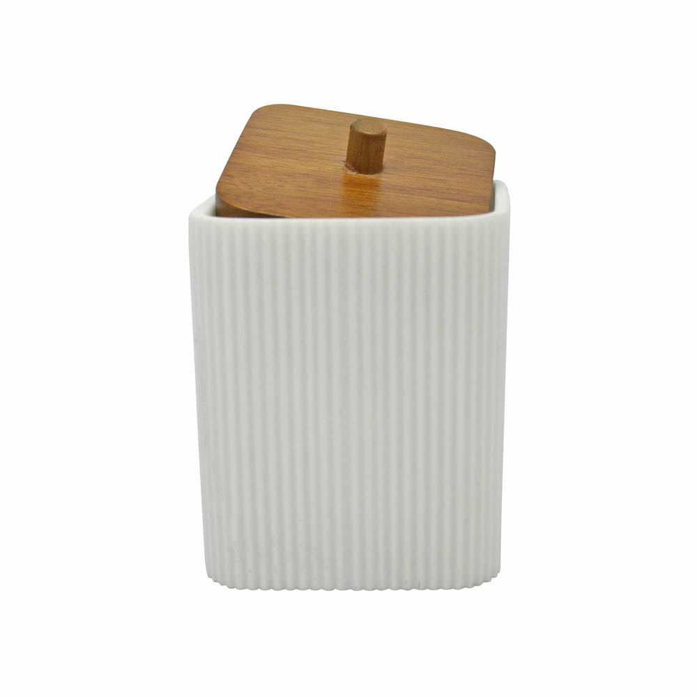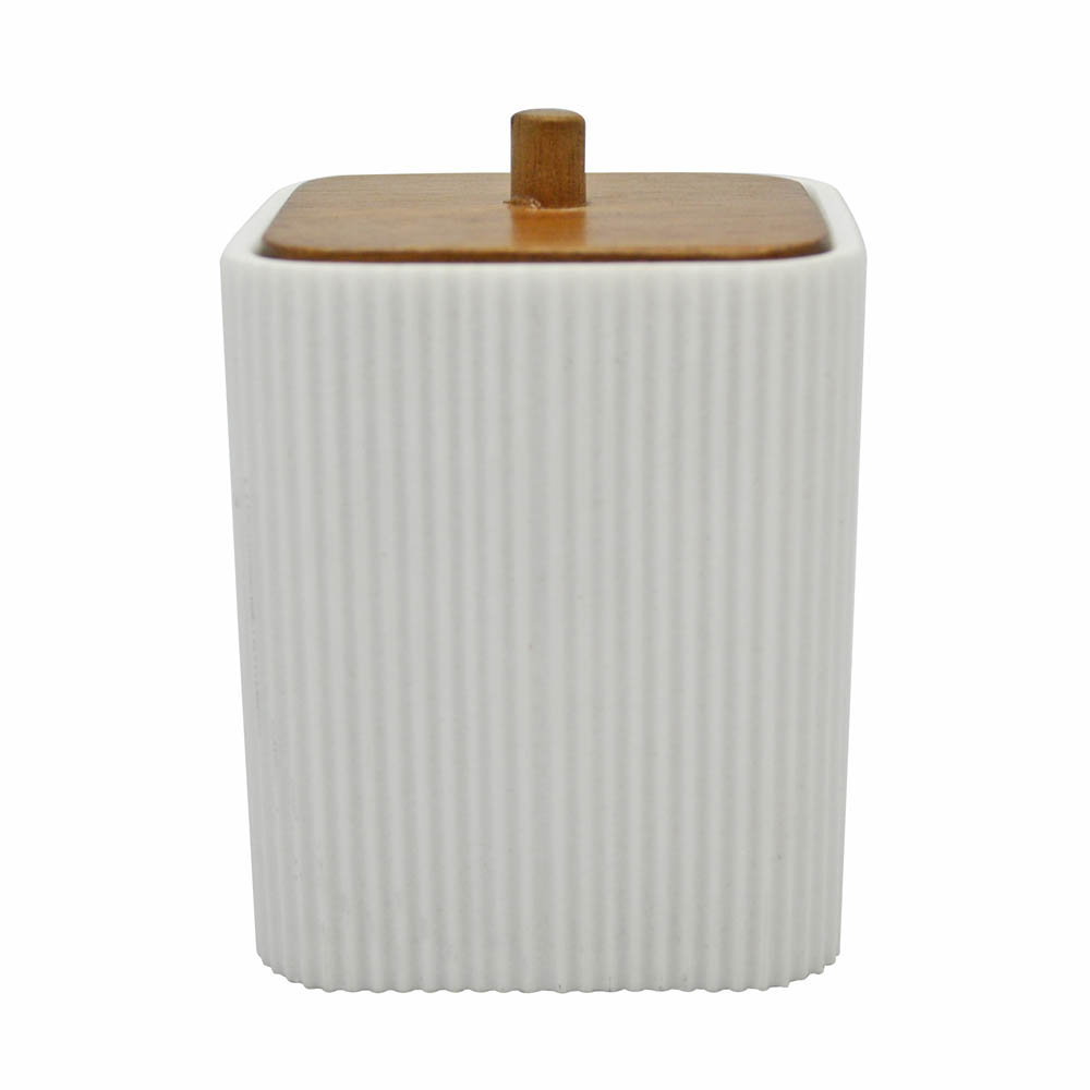 Δοχείο με καπάκι για βαμβάκι ή μπατονέτες, πολυεστερικό σε λευκό χρώμα με διακόσμηση ανάγλυφες γραμμές και καπάκι από ξύλο ακακίας. Αξεσουάρ μπάνιου εξαιρετικής ποιότητας με μοντέρνο και κομψό σχεδιασμό.