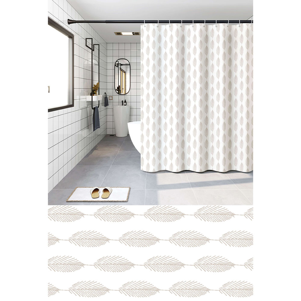 Κουρτίνα πολυεστερική 90gsm, αδιάβροχη, με μοτίβο από λεπτά φύλλα σε απαλή μπεζ απόχρωση, πάνω σε λευκή βάση. Στην συσκευασία συμπεριλαμβάνονται δώδεκα πλαστικοί κρίκοι. Είναι εύκολη στο καθάρισμα, μαλακή και ευχάριστη αν έρθει σε επαφή με το δέρμα.