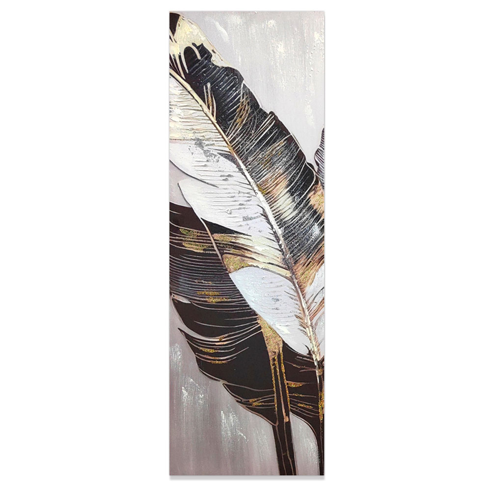 Πίνακας ελαιογραφία σε τυπωμένο καμβά με μια κομψή σύνθεση από φύλλα σε μαύρους, λευκούς και χρυσούς τόνους. Οι μεταλλικές λεπτομέρειες και η ανάγλυφη υφή δημιουργούν μια αίσθηση πολυτέλειας και κίνησης, καθιστώντας το έργο ιδανικό για κάθε χώρο.