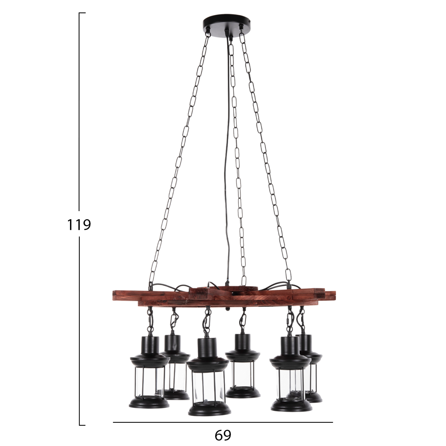 Ανακαλύψτε το εντυπωσιακό 6-φωτο φωτιστικό οροφής FB94116. Ένα φωτιστικό που θα αποτελέσει το κέντρο του ενδιαφέροντος χάρη στο εντυπωσιακό και εμπνευσμένο του design. Τα 6 φαναράκια που περιέχουν τους λαμπτήρες κρέμονται από μια ξύλινη τιμονιέρα πλοίου (πηδάλιο), η οποία με την σειρά της κρέμεται από την οροφή με αλυσίδες.