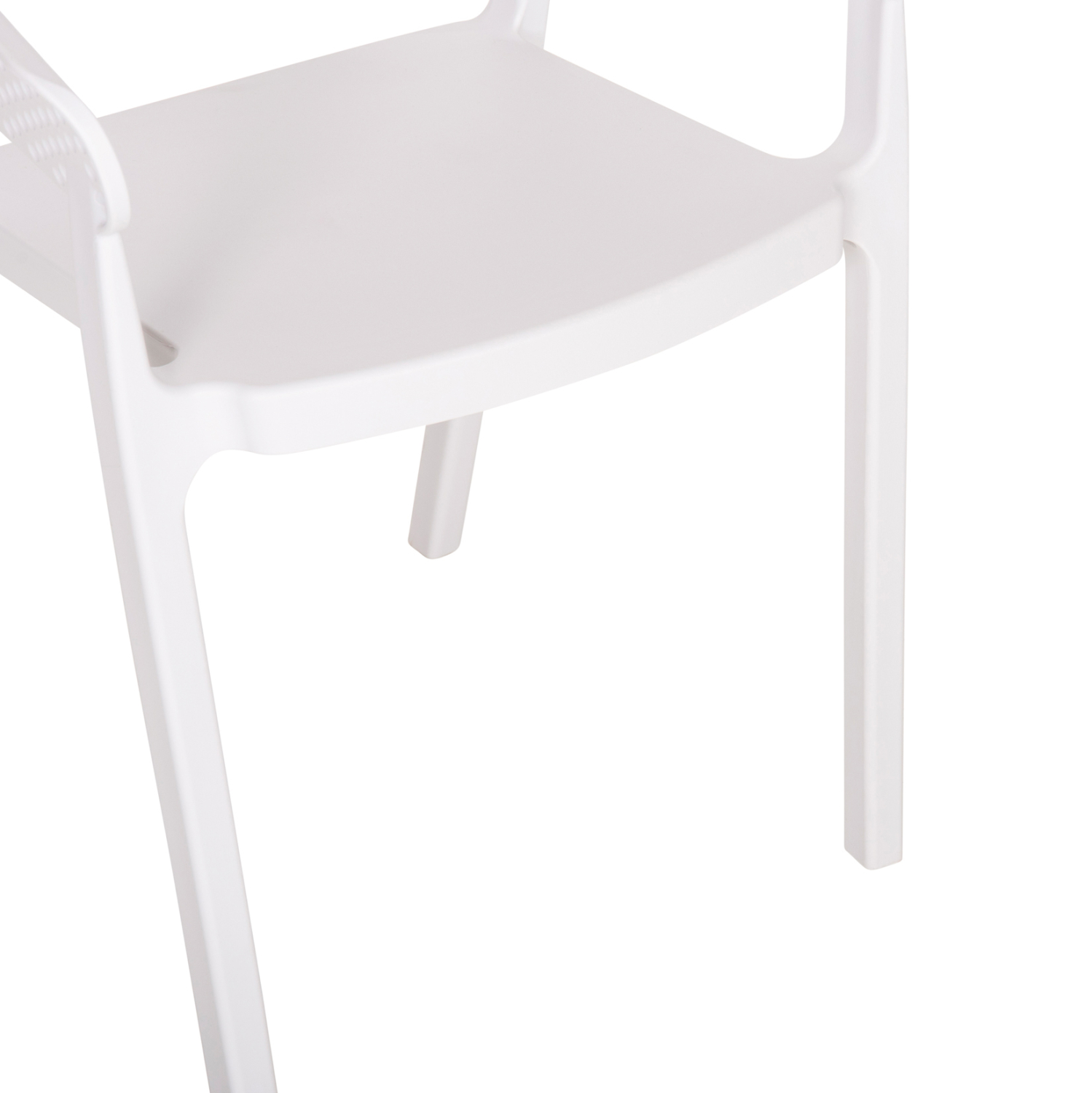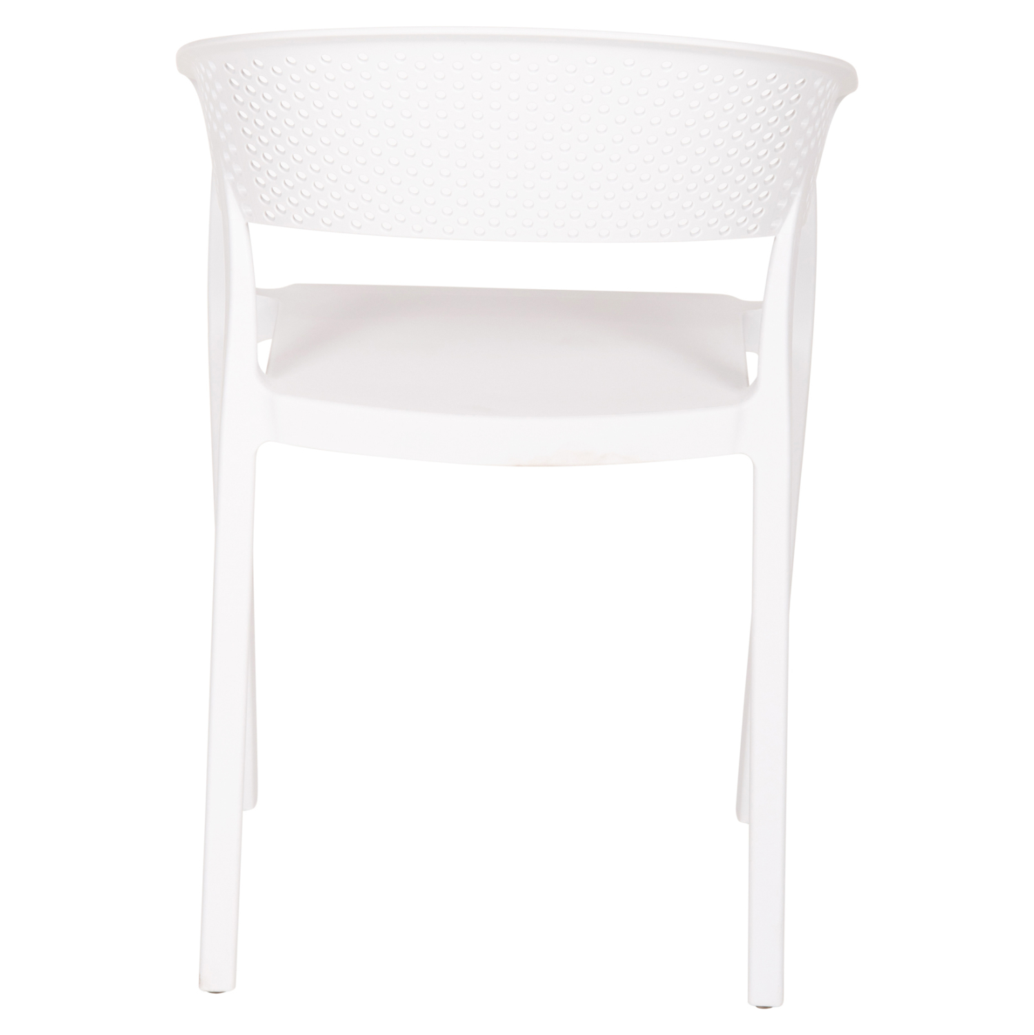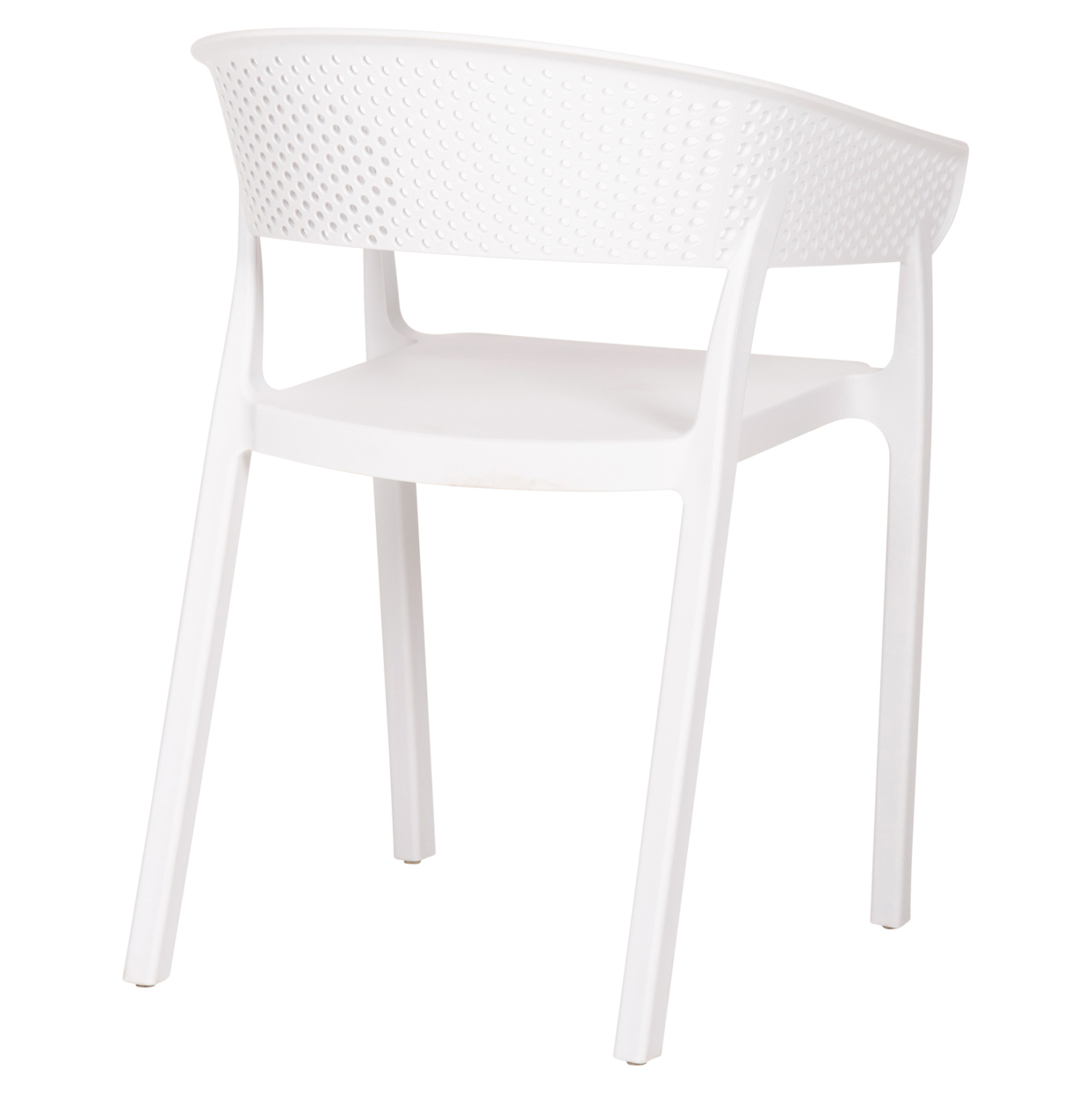 FB95941.01–Πολυθρόνα πολυπροπυλενίου σε ΛΕΥΚΟ χρώμα. Ιδανική πρόταση για χρήση σε εξωτερικούς χώρους, είτε επαγγελματικούς (χώροι δεξιώσεων, εταιρείες catering, κλπ.) είτε για το σπίτι. Η πολυθρόνα αποτελείται από ένα λείο κάθισμα και μια ημικυκλική, ανεξάρτητη και «τρυπητή» πλάτη και μπράτσα. Είναι πανέμορφη και θα αναβαθμίσει αισθητικά κάθε εξωτερικό χώρο.