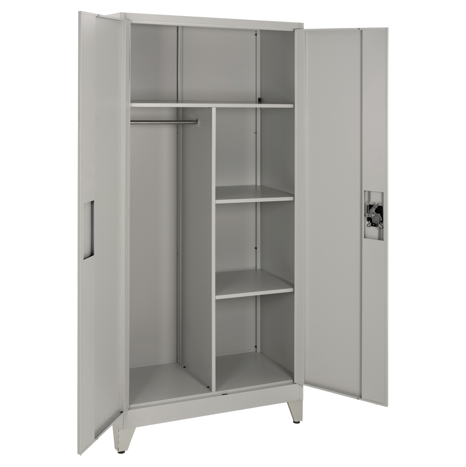 Η FB911981 είναι μια πρακτικότατη μεταλλική ντουλάπα με πόδια, που έχει φτιαχτεί με γνώμονα την χωρητικότητα και την ανθεκτικότητα. Είναι δίφυλλη με τις δύο πόρτες να κλείνουν ακριβώς στην μέση της κατασκευής, ενώ το εσωτερικό είναι χωρισμένο σε 3 κύριους χώρους με μεταλλικό χώρισμα σε σχήμα Τ. Το επάνω μέρος είναι ενιαίο σαν παταράκι, ενώ η μία πλευρά διαθέτει μεταλλική μπάρα για κρέμαση αντικειμένων και η άλλη διαθέτει 2 ράφια που δημιουργούν 3 επίπεδα αποθήκευσης. Οι πόρτες διαθέτουν κλειδαριά που κλειδώνει με κλειδί, ενώ το χρώμα της ντουλάπας είναι πολύ ανοιχτό γκρι.
