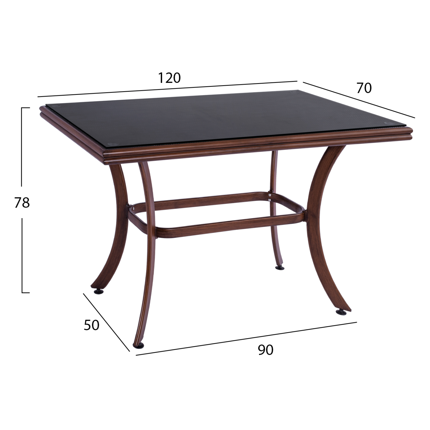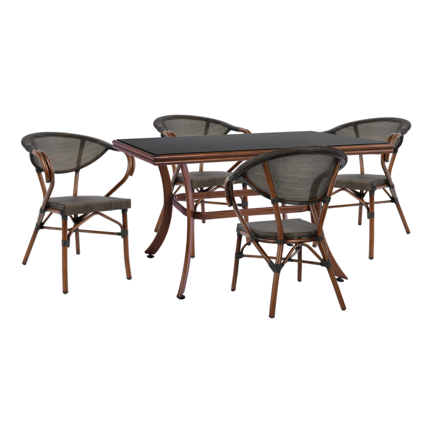FB910547—Σετ εξωτερικού χώρου με τραπέζι με αλουμινένιο σκελετό σε καφέ bamboo look και γυάλινη ΕΝΙΣΧΥΜΕΝΗ επιφάνεια με μαύρο textilene, και 4 πολυθρόνες αλουμινίου σε καφέ bamboo look με textilene σε καφέ χρώμα.