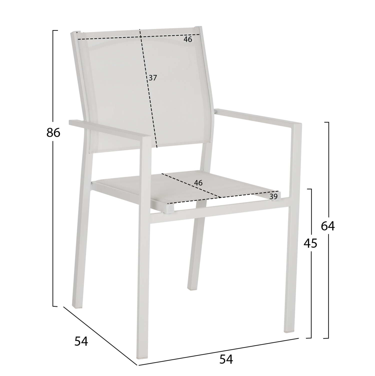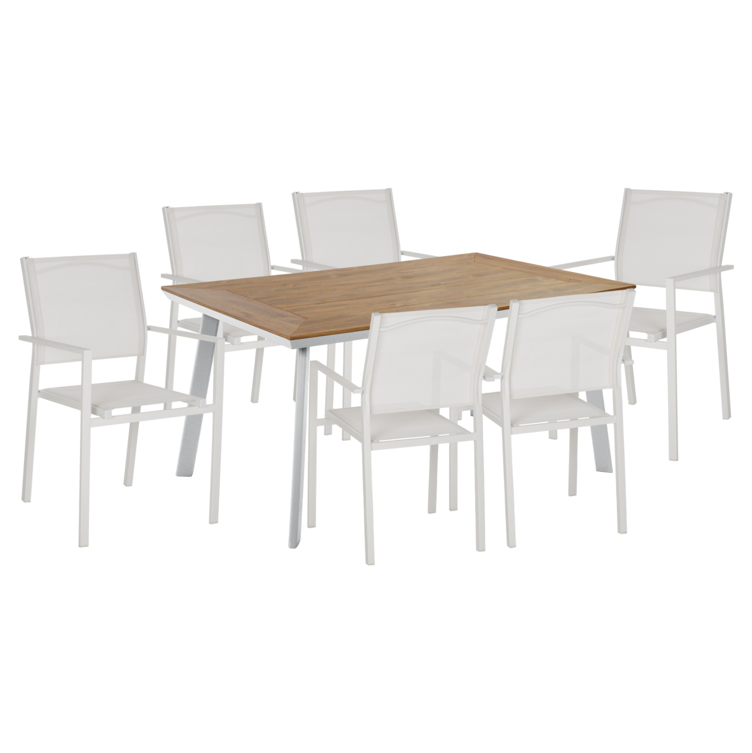 FB911831—Σετ εξωτερικού χώρου με τραπέζι με ΛΕΥΚΟ αλουμινένιο σκελετό και επιφάνεια από polywood και 6 μεταλλικές πολυθρόνες με textilene, σε ΛΕΥΚΟ χρώμα.