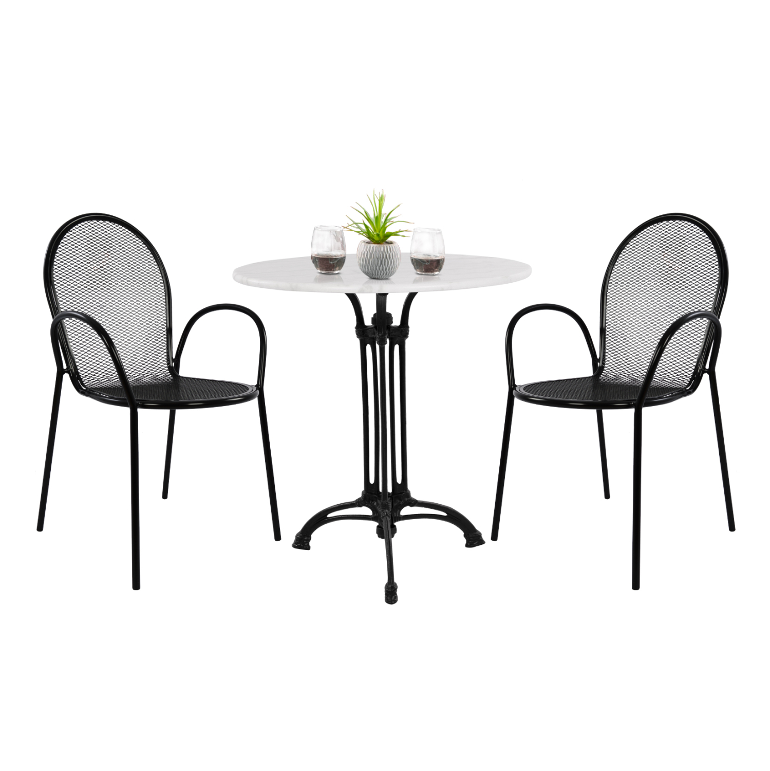 FB911881—Σετ εξωτερικού χώρου με στρογγυλό 3-νυχο τραπέζι με ΜΑΥΡΟ μαντεμένιο σκελετό και ΛΕΥΚΗ μαρμάρινη επιφάνεια και 2 ΜΑΥΡΕΣ μεταλλικές πολυθρόνες με διάτρητο στυλ.