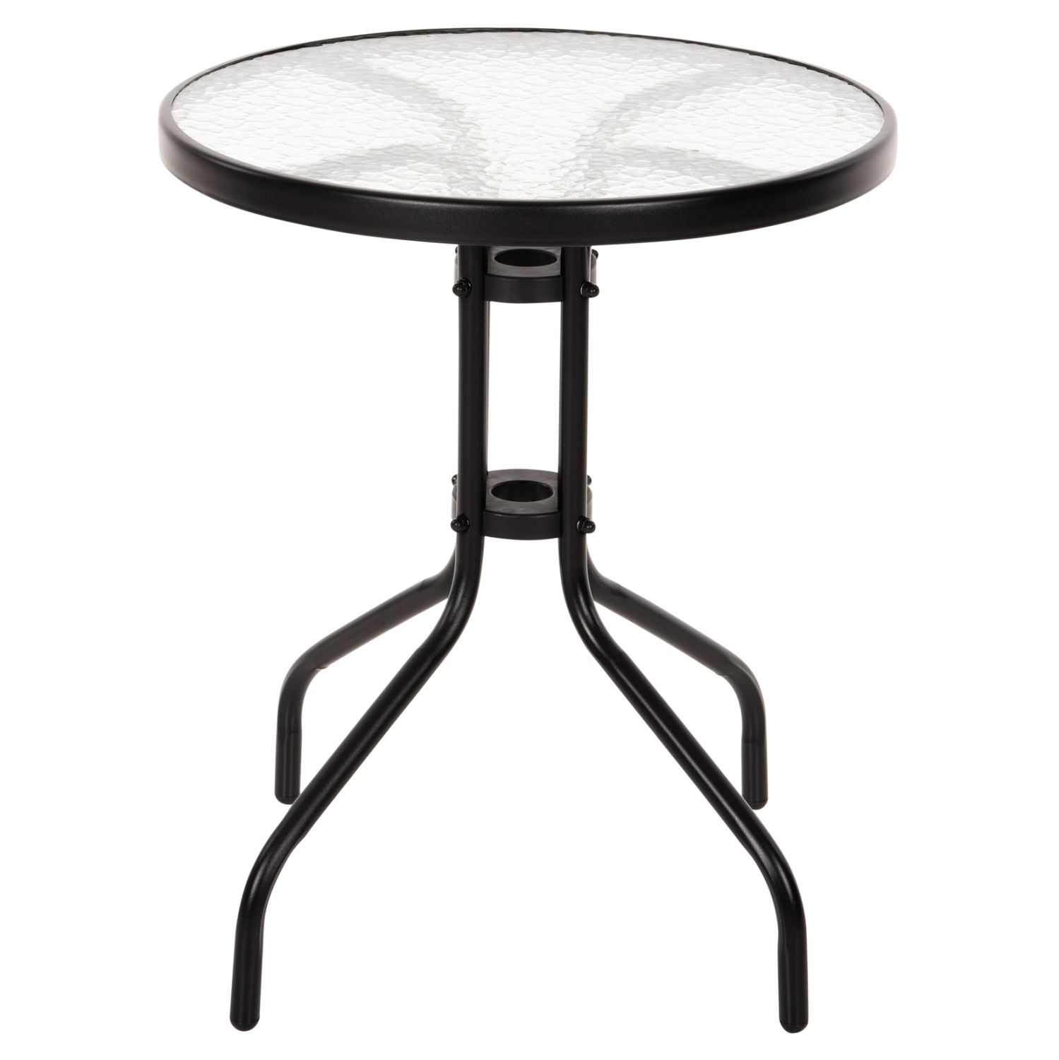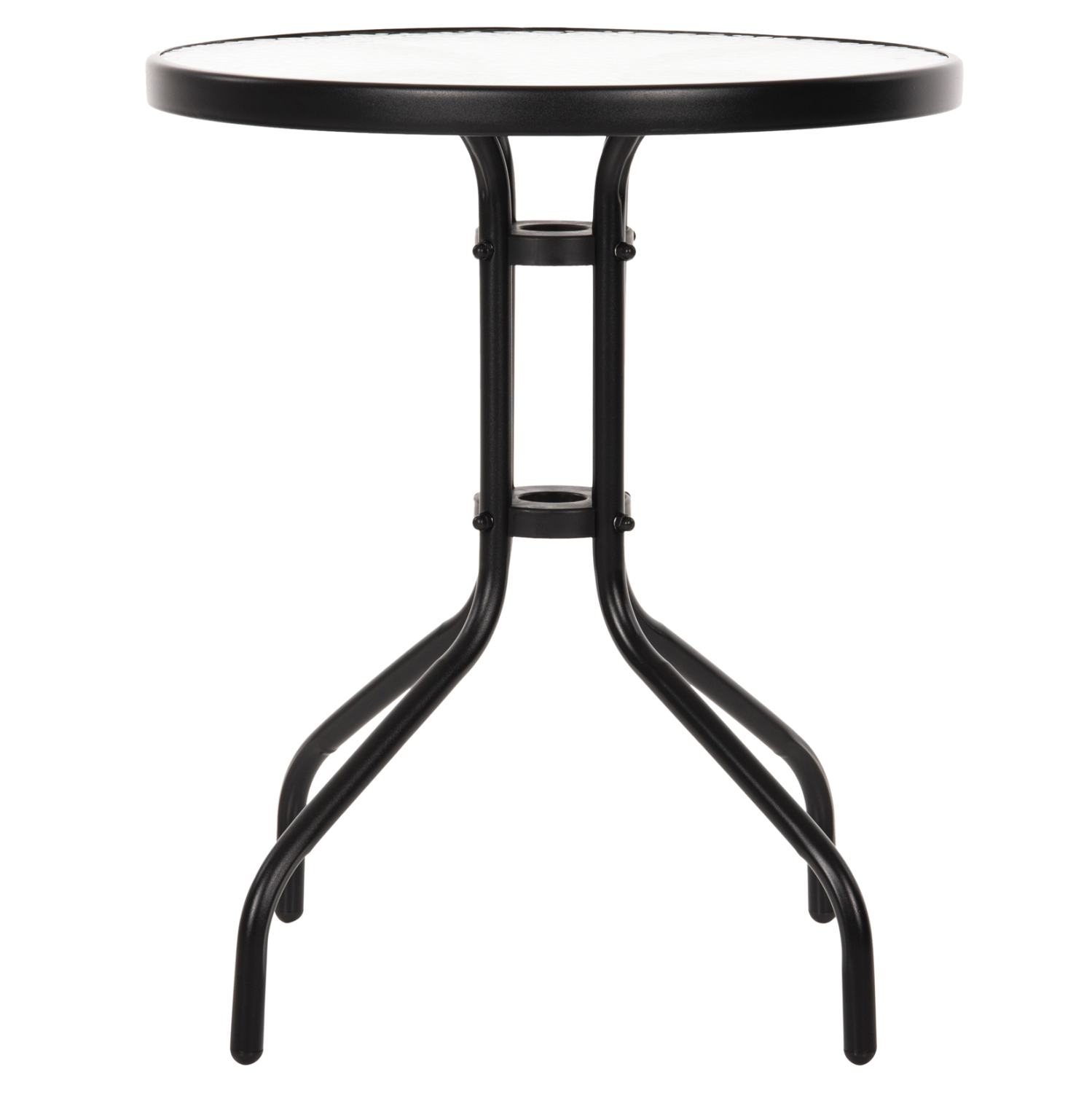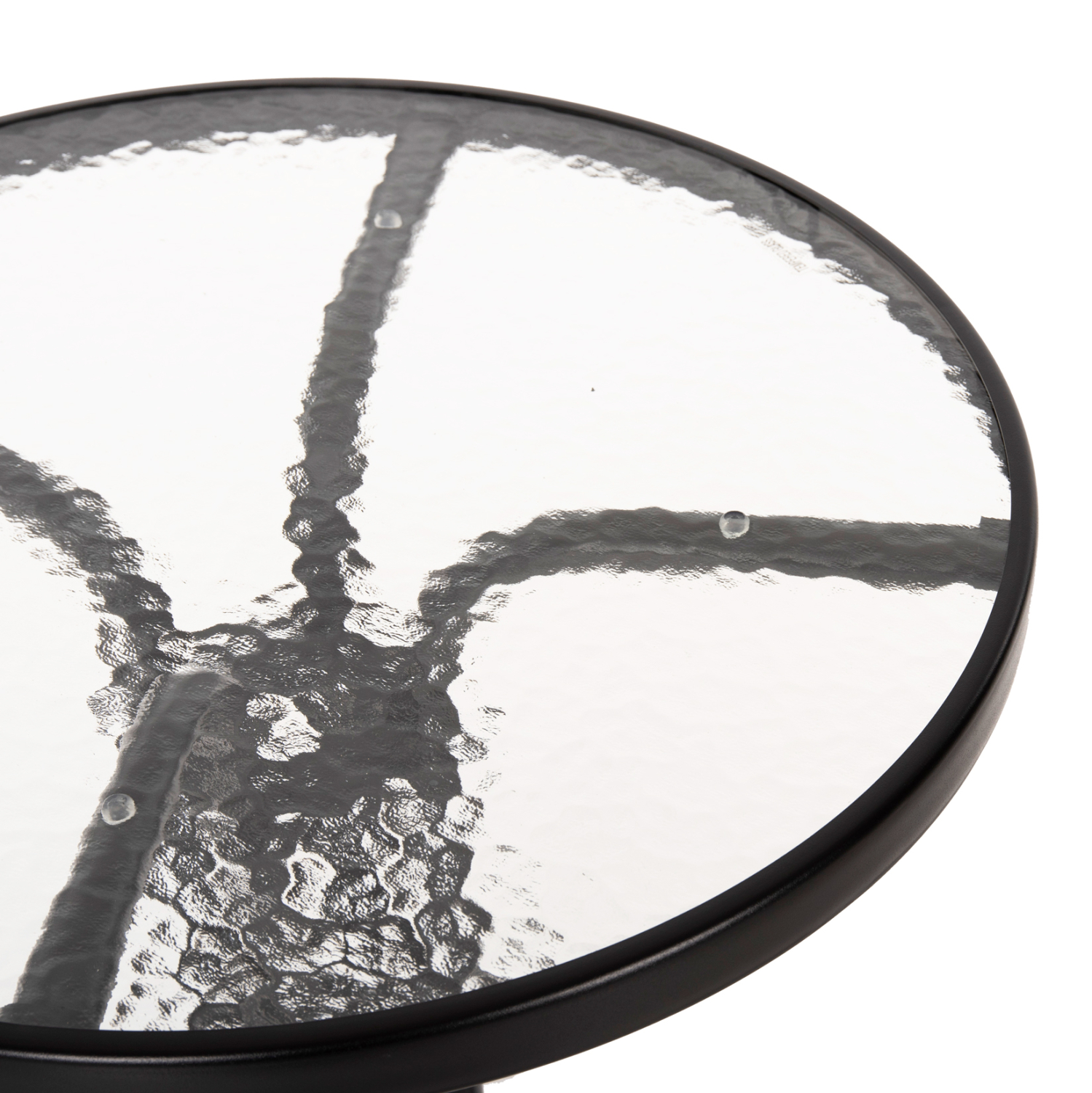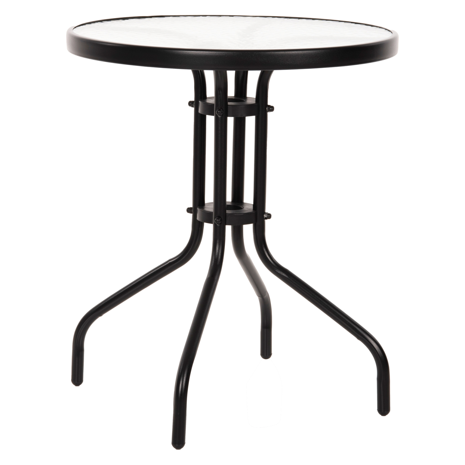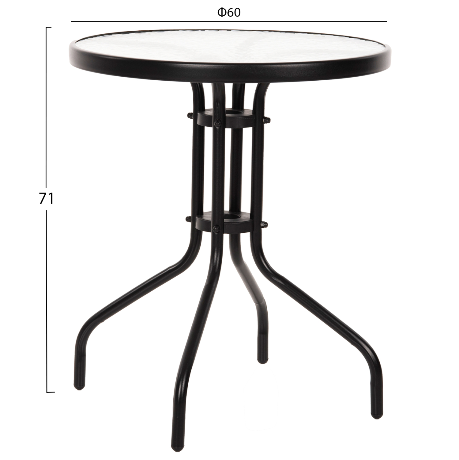 Το FB95079.03 είναι ένα στρογγυλό τραπέζι με επιφάνεια από ημιδιάφανο γυαλί ασφαλείας και μεταλλικά πόδια σε μαύρο χρώμα. Η γυάλινη επιφάνεια στηρίζεται σε έναν κυκλικό μεταλλικό «δακτύλιο» ο οποίος με την σειρά του στηρίζεται στην διάταξη των ποδιών. Ένα όμορφο και στιβαρό τραπέζι που θα ομορφύνει τον εξωτερικό σας χώρο.