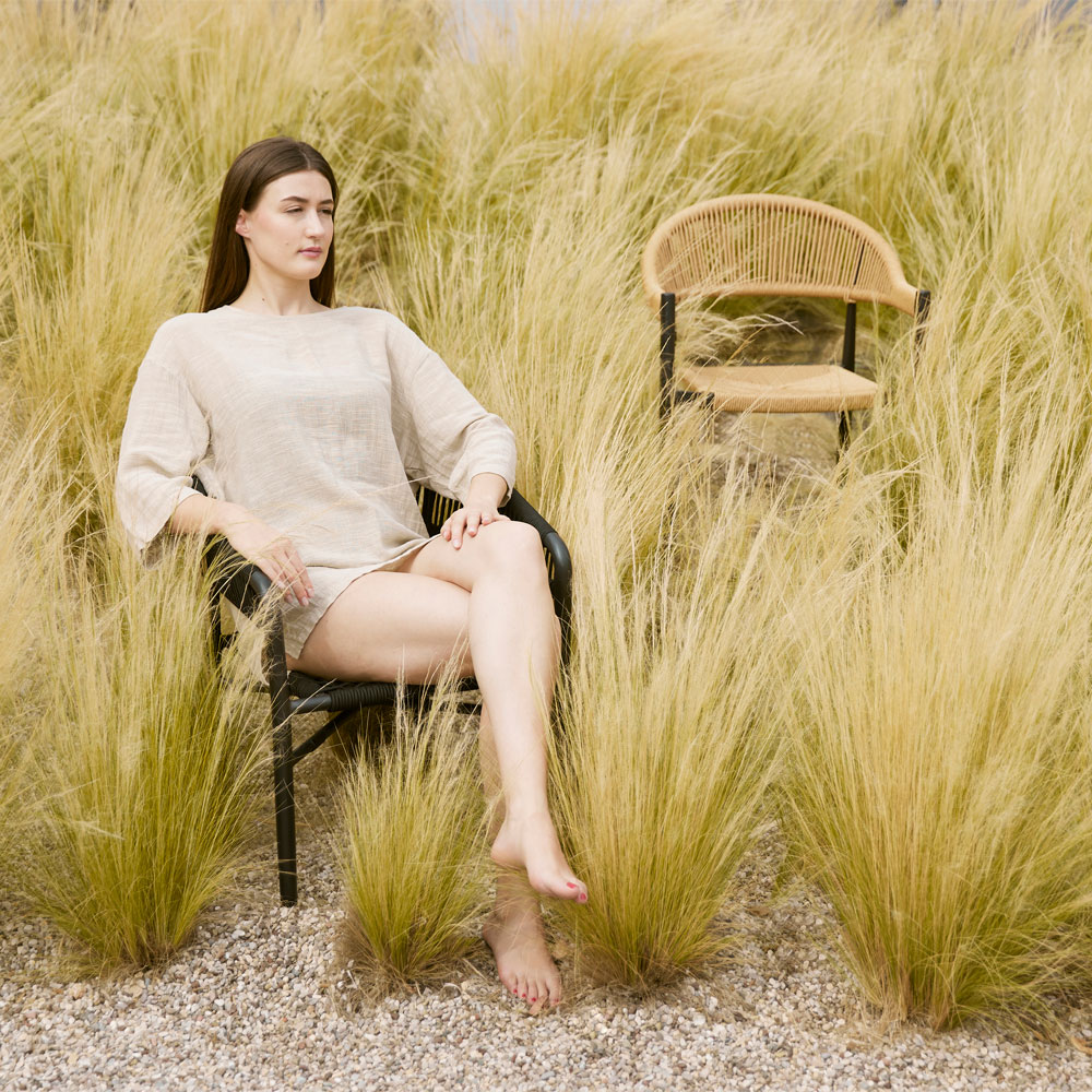 Η καρέκλα Mezza Luna συνδυάζει την κομψότητα με την πρακτικότητα, αποτελώντας μια εξαιρετική επιλογή για μοντέρνους χώρους. Διαθέτει επένδυση από PE Round Woven, ένα συνθετικό υλικό από πολυαιθυλένιο με κυκλική ύφανση, σε φυσική απόχρωση που προσδίδει ζεστασιά και φυσικό χαρακτήρα. Ο στιβαρός σκελετός της, κατασκευασμένος από μαύρο αλουμίνιο με ηλεκτροστατική βαφή, εξασφαλίζει ανθεκτικότητα και αντοχή στις καιρικές συνθήκες. Η δυνατότητα στοίβαξης προσφέρει ευκολία στη χρήση και αποθήκευση, καθιστώντας την ιδανική τόσο για εσωτερικούς όσο και για εξωτερικούς χώρους. Η Mezza Luna ενσωματώνει λειτουργικότητα και διαχρονική αισθητική.