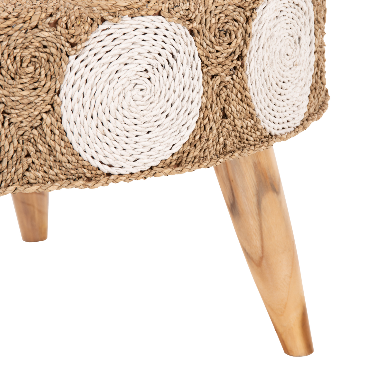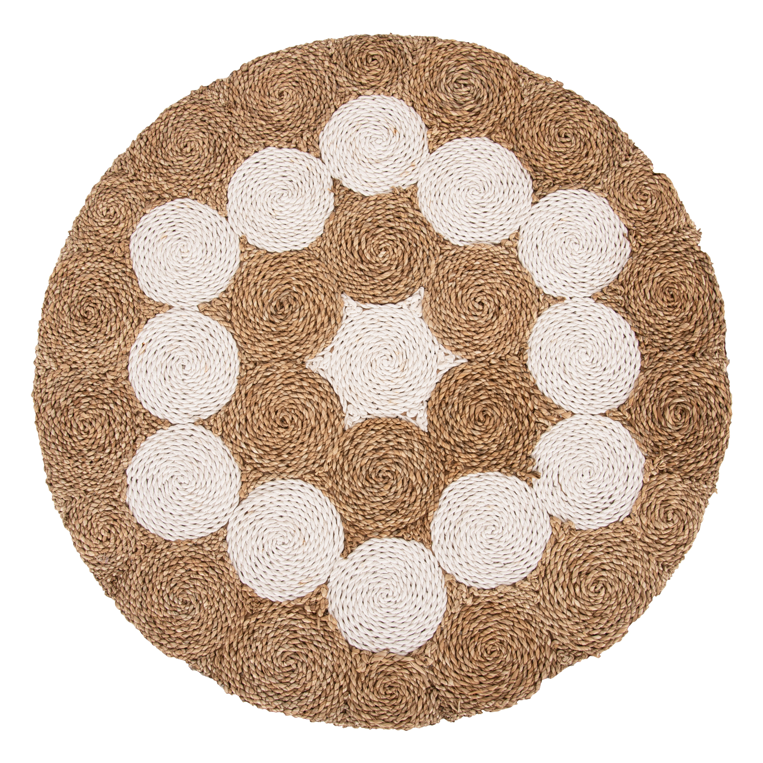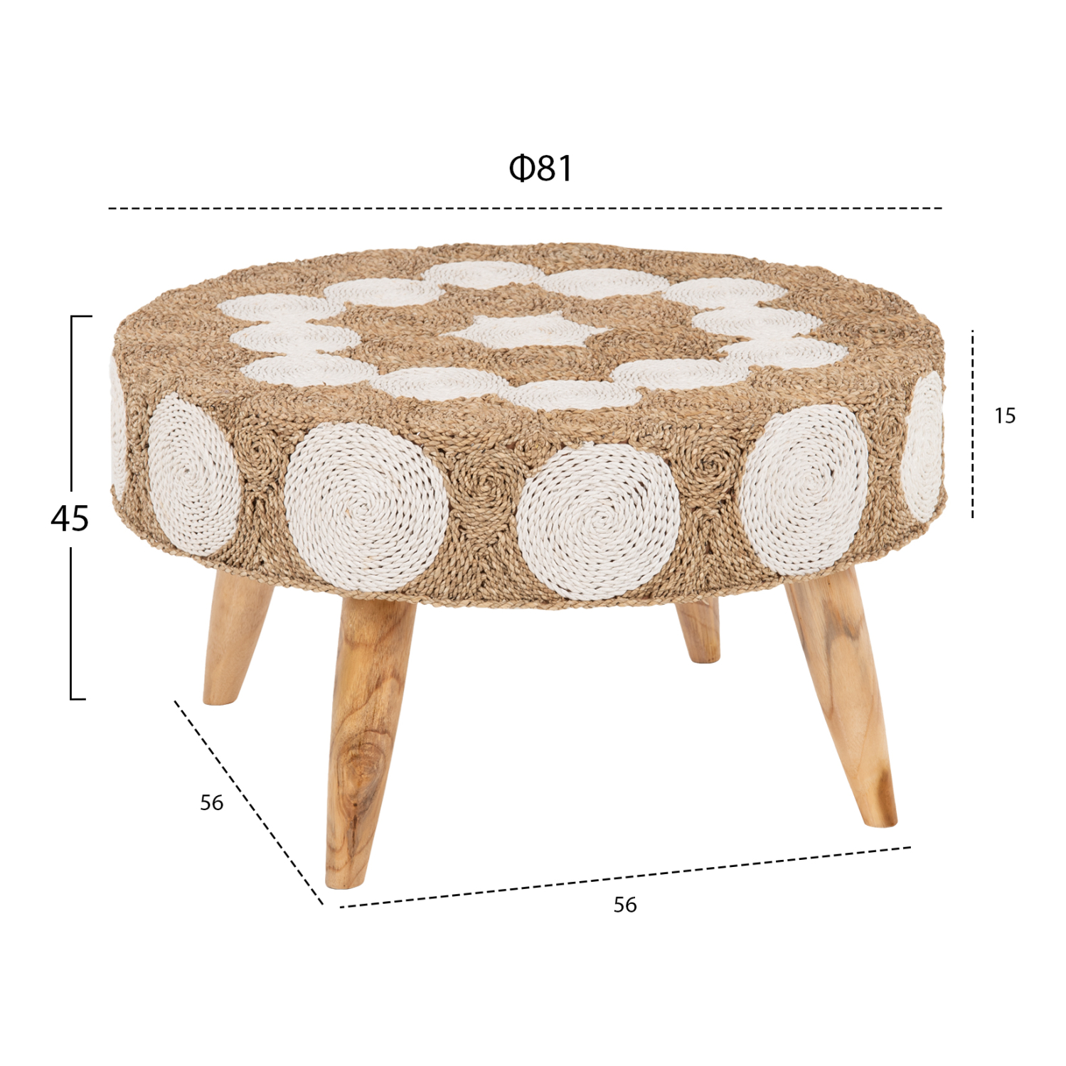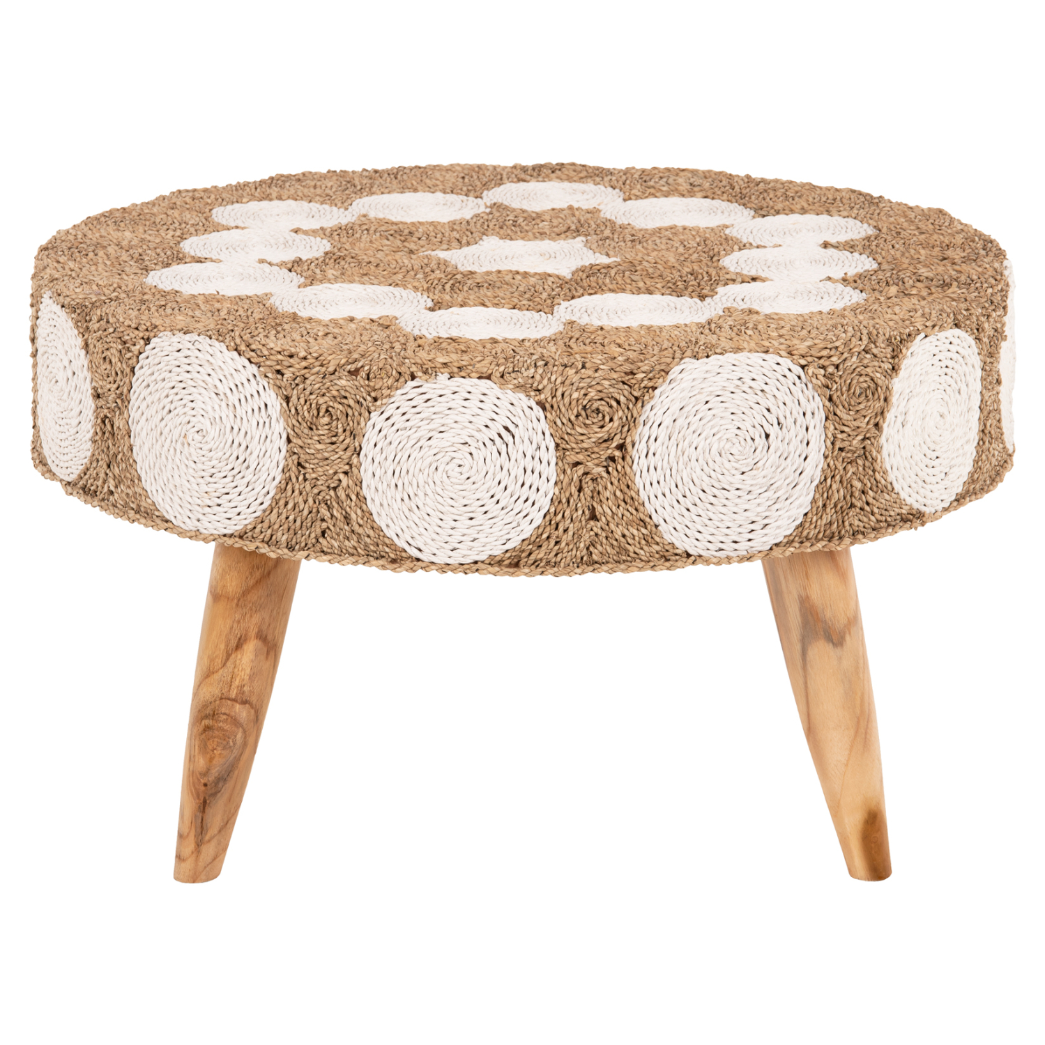 Το FB97825 είναι ένα στρογγυλό τραπέζι για το σαλόνι, με ικανοποιητικές διαστάσεις σε φυσικό και λευκό χρώμα ξύλου και επένδυσης. Ο σκελετός του τραπεζιού και τα πόδια είναι κατασκευασμένα από ξύλο ΤΕΑΚ ενώ η επένδυση του τραπεζιού έχει γίνει με μια πολύ ιδιαίτερη ψάθα, με κυκλικά σχέδια. Πρόκειται για ένα τραπέζι που θα δώσει μια άλλη αίσθηση στο σαλόνι σας, πολύ ξεχωριστή.