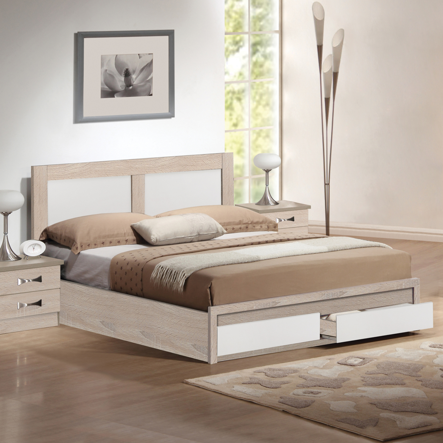 Το κρεβάτι FB9665.06 σε διάσταση για ημίδιπλο στρώμα 120×200 εκ, είναι μια άριστης ποιότητας, κλασική και ασφαλής επιλογή που θα ταιριάξει σε κάθε υπνοδωμάτιο. Το χαρακτηριστικό του είναι ότι πατάει απευθείας στο δάπεδο και εκμεταλλεύεται τον χώρο κάτω από τις τάβλες του σομιέ με 2 εύχρηστα συρτάρια που βγαίνουν από την πλευρά του «ποδαρικού» (η επιφάνεια απέναντι από το κεφαλάρι). Όλες οι γωνίες είναι τετραγωνισμένες χωρίς καμία καμπύλη, ενώ o sonoma-λευκός χρωματισμός είναι ευχάριστος, και μπορεί να συνδυαστεί με πληθώρα διακοσμητικών μοτίβων στον χώρο σας.