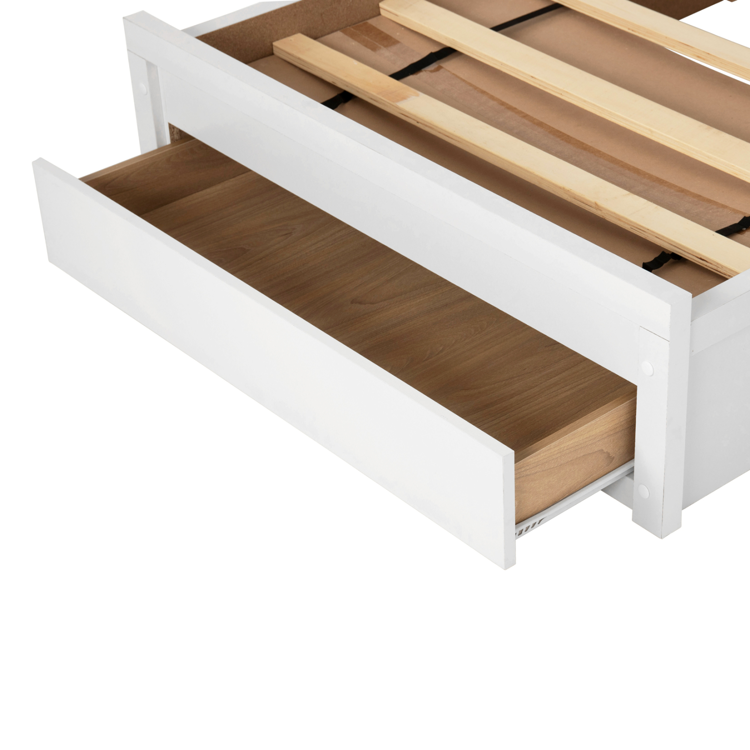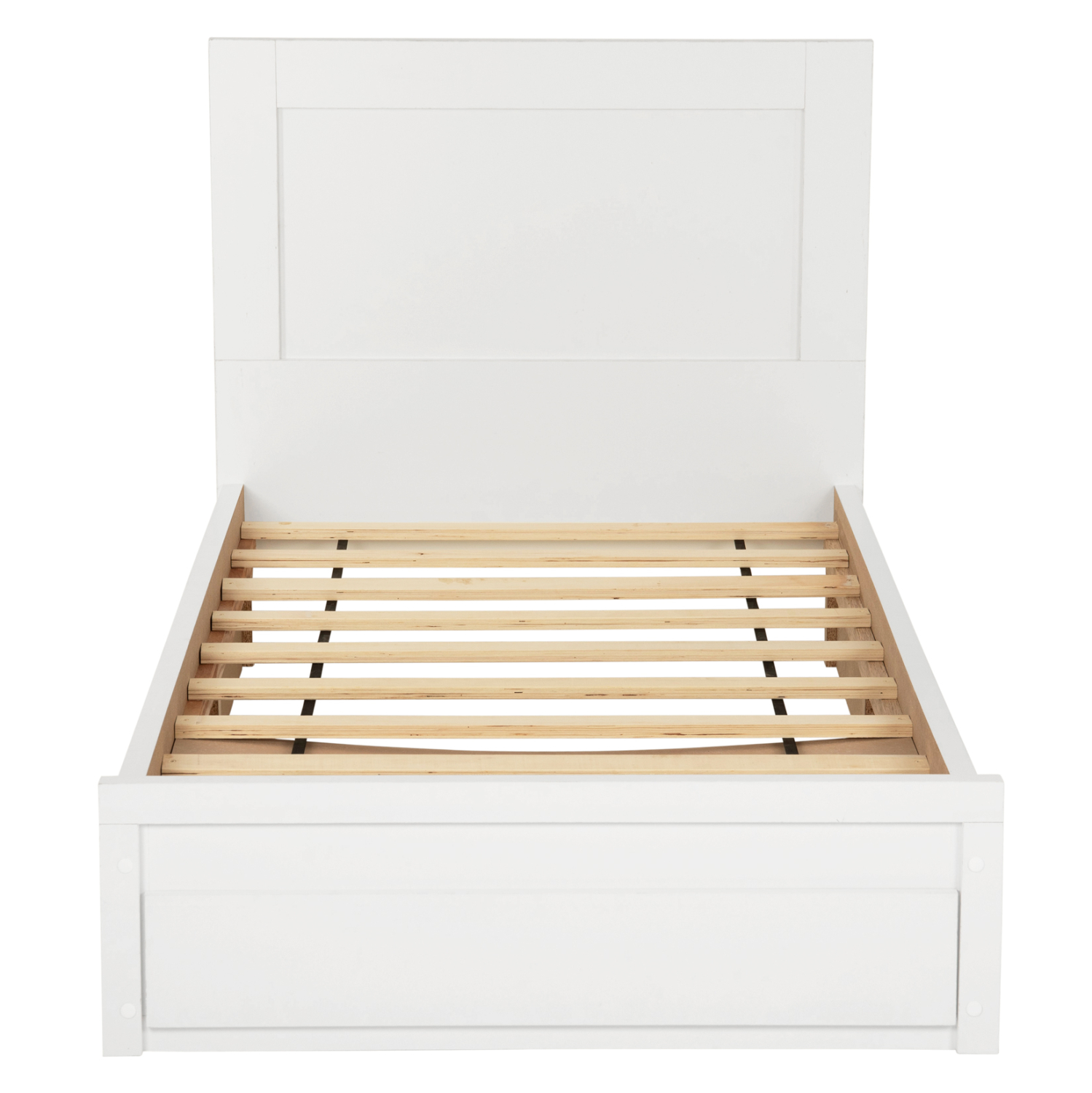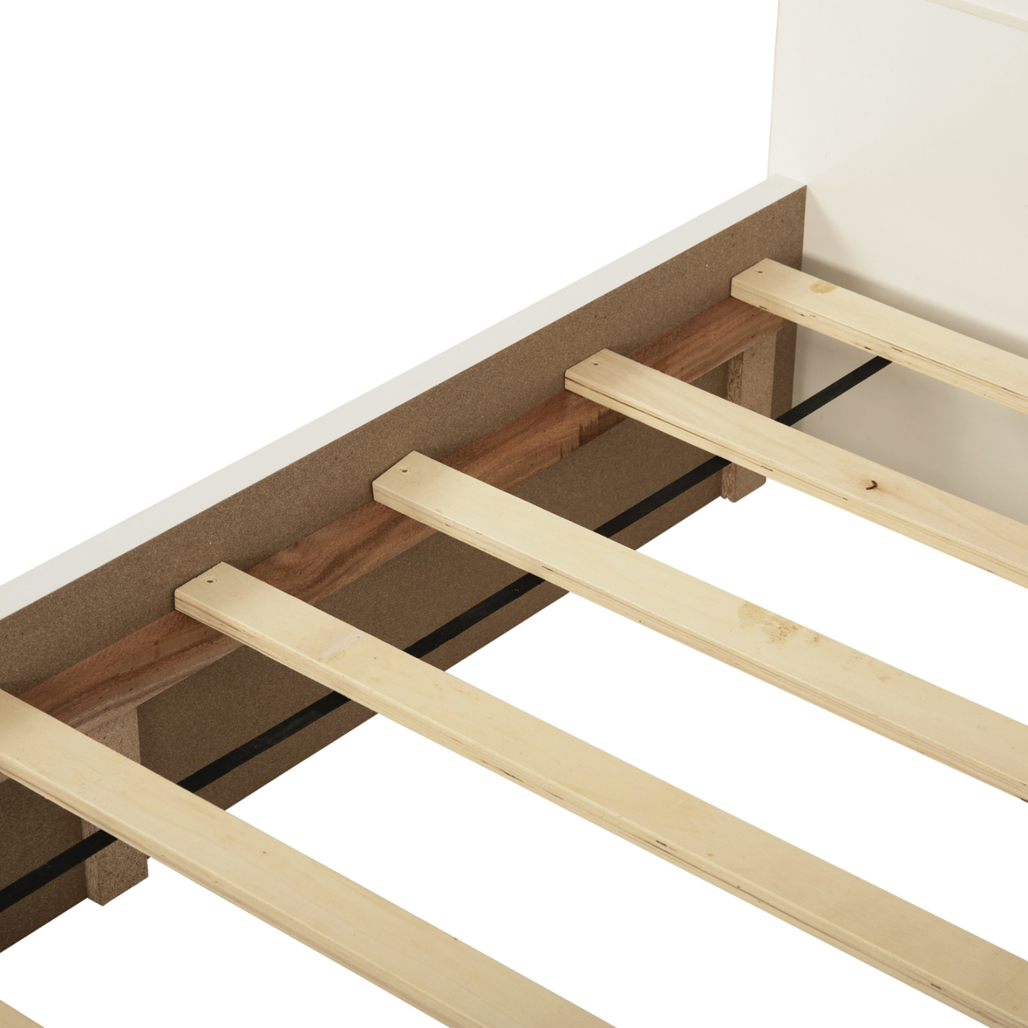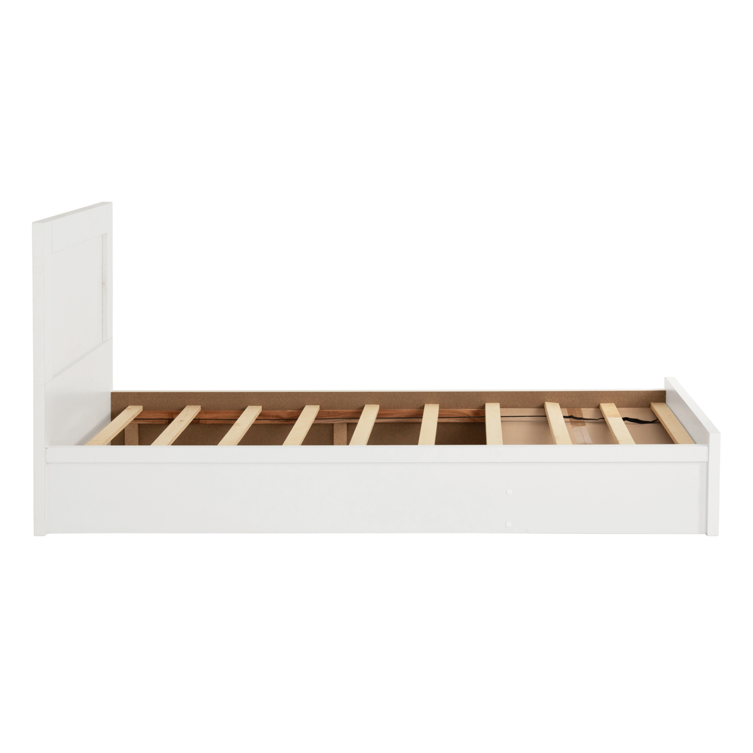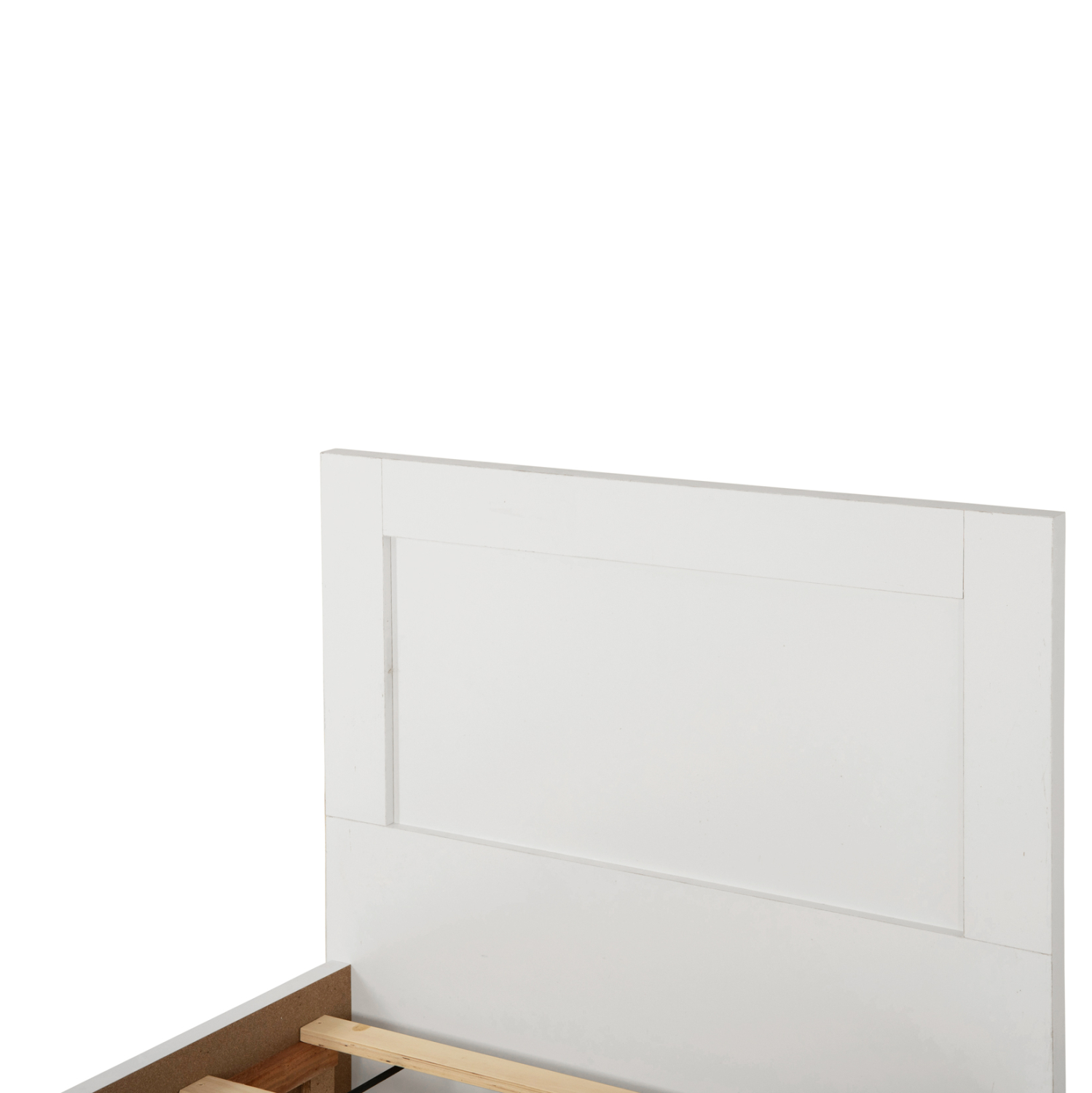 Το κρεβάτι FB9346.05 σε διάσταση για μονό στρώμα 90×190 εκ, είναι μια άριστης ποιότητας, κλασική και ασφαλής επιλογή που θα ταιριάξει σε κάθε υπνοδωμάτιο. Το χαρακτηριστικό του είναι ότι πατάει απευθείας στο δάπεδο και εκμεταλλεύεται τον χώρο κάτω από τις τάβλες του σομιέ με 1 μεγάλο συρτάρι που βγαίνει από την πλευρά του «ποδαρικού» (η επιφάνεια απέναντι από το κεφαλάρι). Όλες οι γωνίες είναι τετραγωνισμένες χωρίς καμία καμπύλη, ενώ το ΛΕΥΚΟ χρώμα είναι ευχάριστο και ουδέτερο, και μπορεί να συνδυαστεί με πληθώρα διακοσμητικών μοτίβων στον χώρο σας.