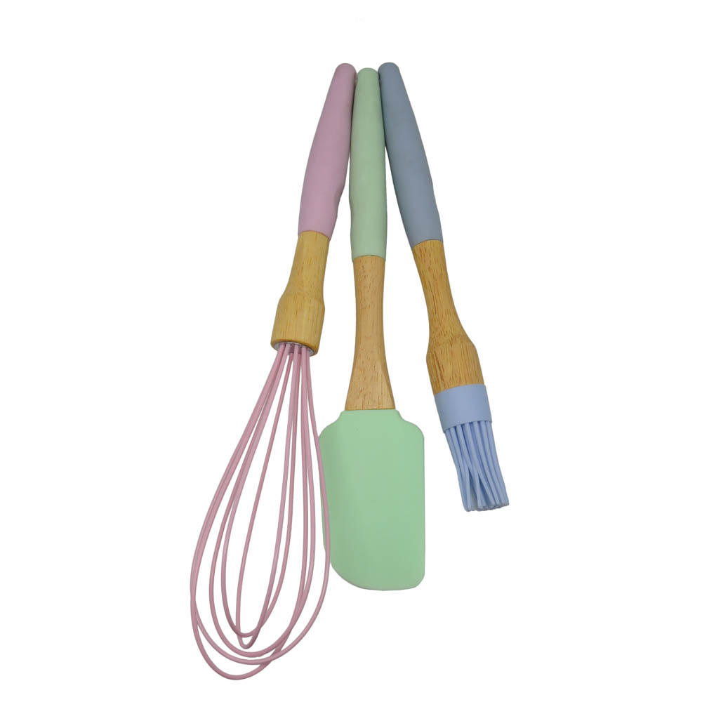 Σετ τριών τεμαχίων εργαλεία κουζίνας το οποίο αποτελείται από έναν αυγοδάρτη, μία σπάτουλα και ένα πινέλο, με εργονομικές λαβές από ξύλο και σιλικόνη σε ροζ, σιελ και πράσινο χρώμα