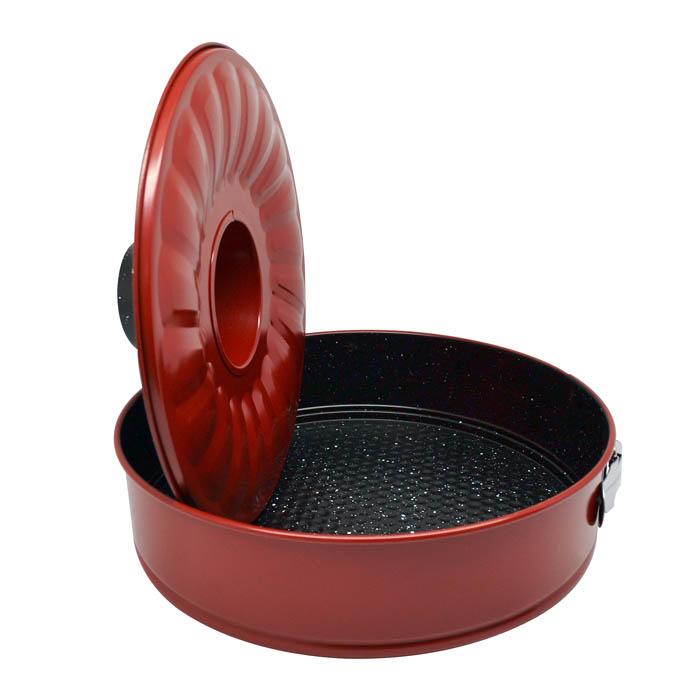 Φόρμα με αντικολλητική επίστρωση υψηλής ποιότητας διαιρούμενη σε τρία τεμάχια, σε μαύρο χρώμα με εφέ μάρμαρο και εξωτερικά σε κόκκινο χρώμα. Το σετ αποτελείται από ταψάκι, τσέρκι και φόρμα για κέικ.Κατάλληλη για ψήσιμο στον αέρα αλλά και στις αντιστάσεις.