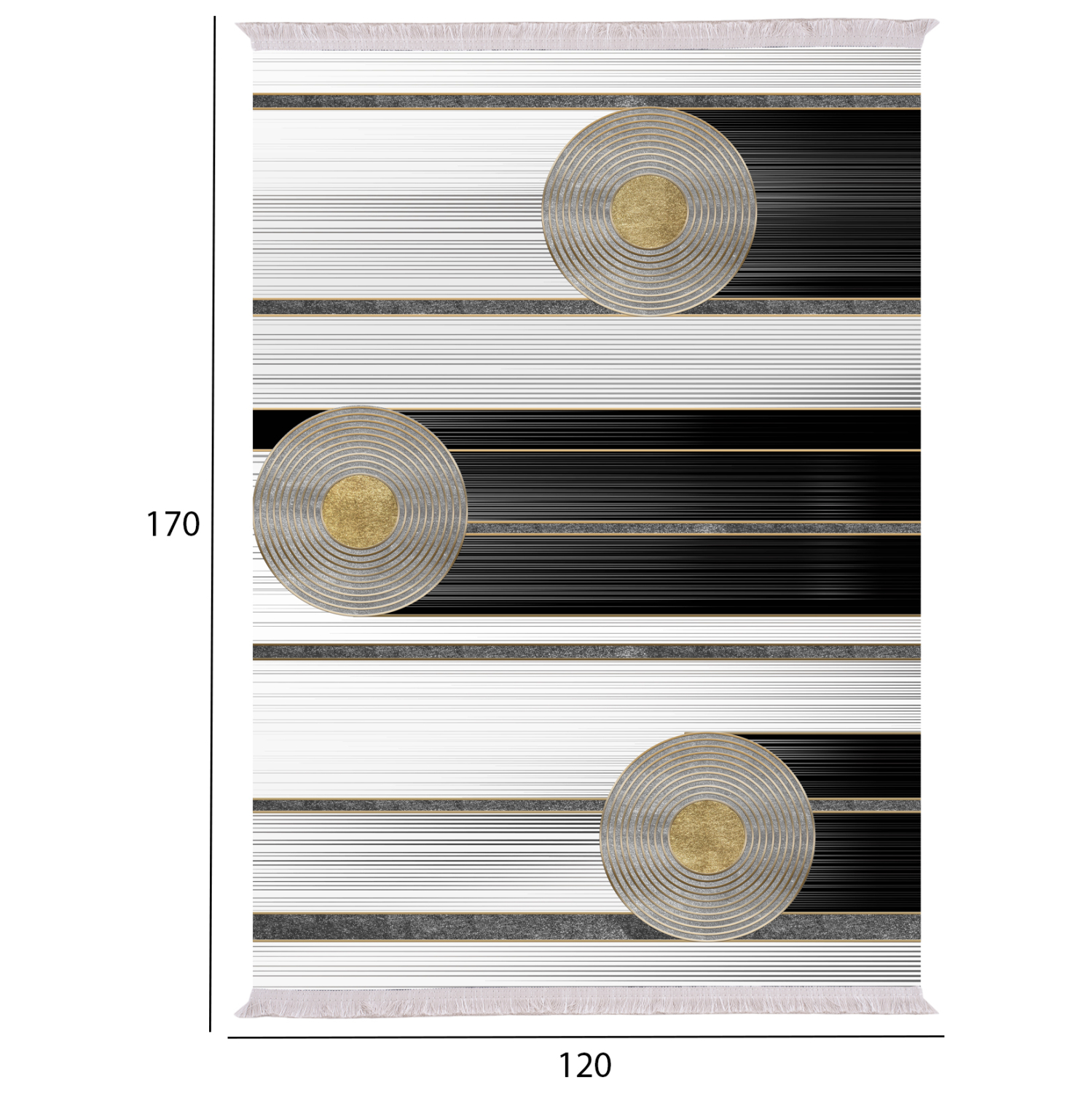 Το χαλί FB97677.24 είναι μοντέρνο από όποια οπτική κι αν το δεις. Έχει κυρίαρχα χρώματα το άσπρο, το γκρι, το μαύρο και το χρυσό. Το έντονο χαρακτηριστικό του είναι οι λευκοί δίσκοι με τα χρυσά κέντρα, που δίνουν την αίσθηση της αιώρησης και της κίνησης και φυσικά θα προκαλέσει το ενδιαφέρον με την ιδιαίτερη λεπτομέρεια και συμμετρία των γραμμών του. Σίγουρα θα αναβαθμίσει αισθητικά το σαλόνι σας.